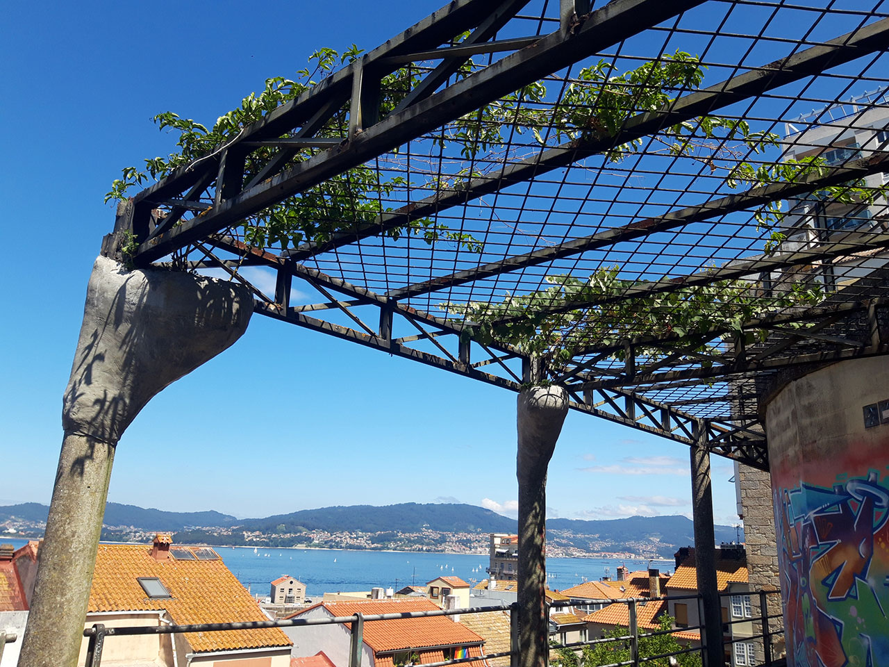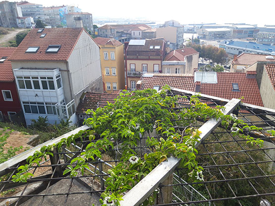 Quisimos plantar la pérgola existente, del Mirador del Paseo Alfonso XII, con plantas enredaderas. Para ello realizamos grandes tiestos colgantes plantados con uva-fresa y maracuyá.