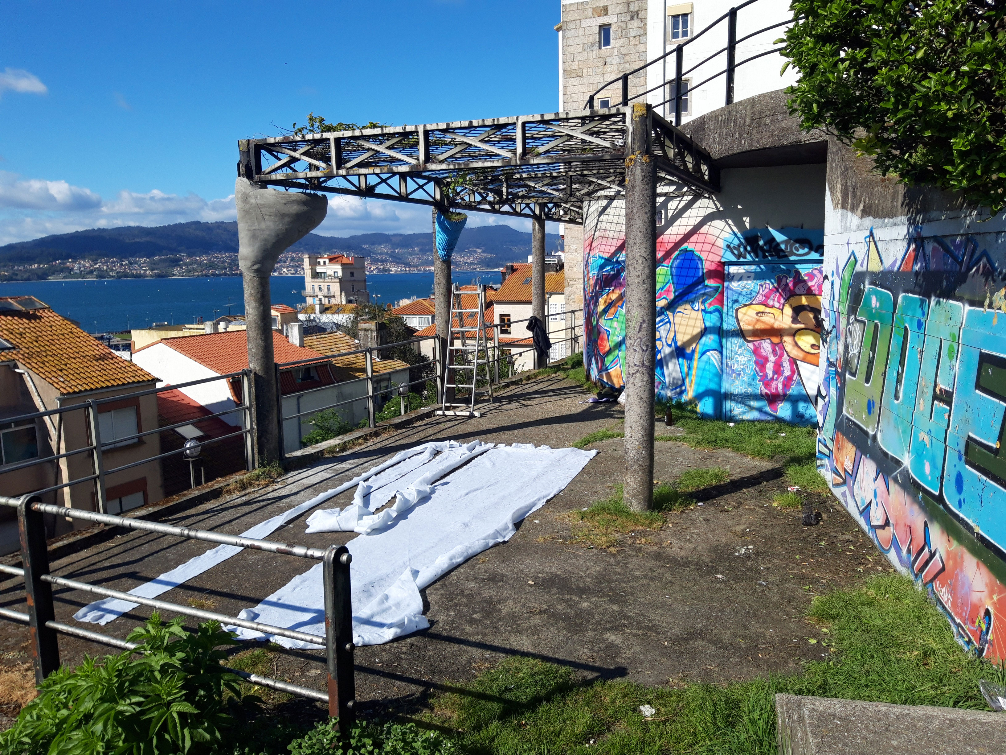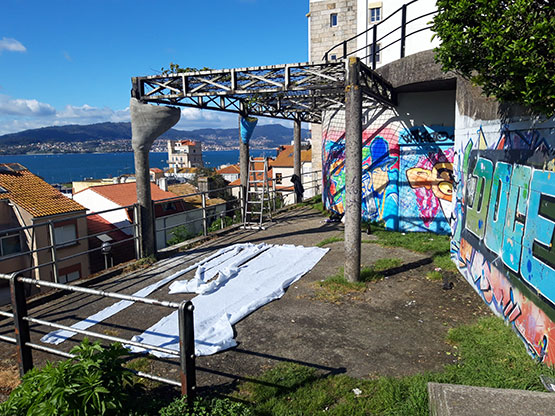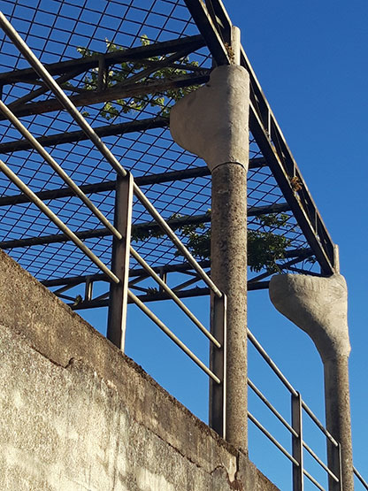 Usamos la técnica del "papier maché", pero con tiras de cemento. Conseguimos macetas de ciento cincuenta litros con forma de cucurucho, suspendidas a las columnas existentes de hormigón.